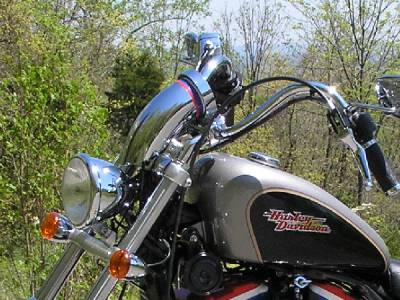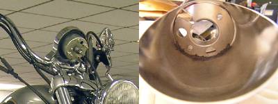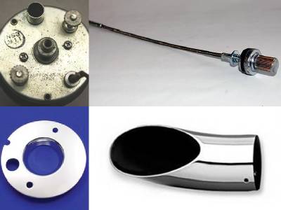 - Speedometer Housing: an FXR speedometer with a remote trip odometer reset cable, a chrome cover for the back of the normal speedo housing and an exhaust tip from an FLH exhaust. The chrome cover was cut to fit the speedometer and then inserted into the exhaust tip. The speedometer was placed in the mounting location and then JB Weld was used on the chrome cover to hold it in place. The idea was to lock the mounting bracket inside the exhaust tip so that when applied to the back of the speedo, it would hold in place.
