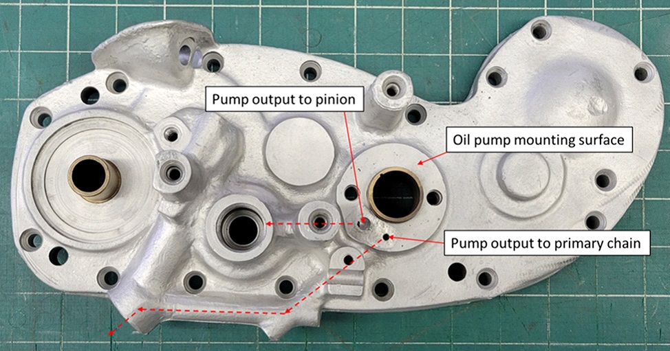 With that introduction to the oiling system let’s follow the oil through the system pictorially from the time it leaves the mechanical oil pump until it exits the engine to the primary chain. The pump output is partitioned between engine oil and primary chain oil as shown in Figure 1 below.