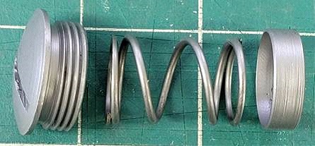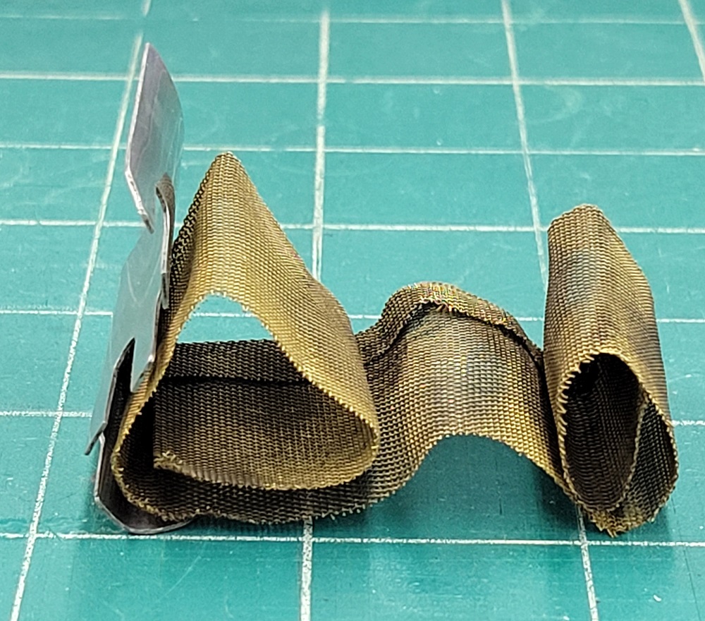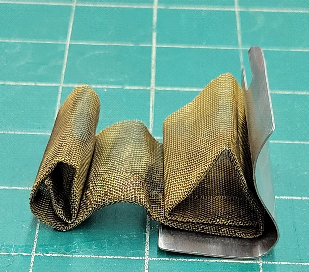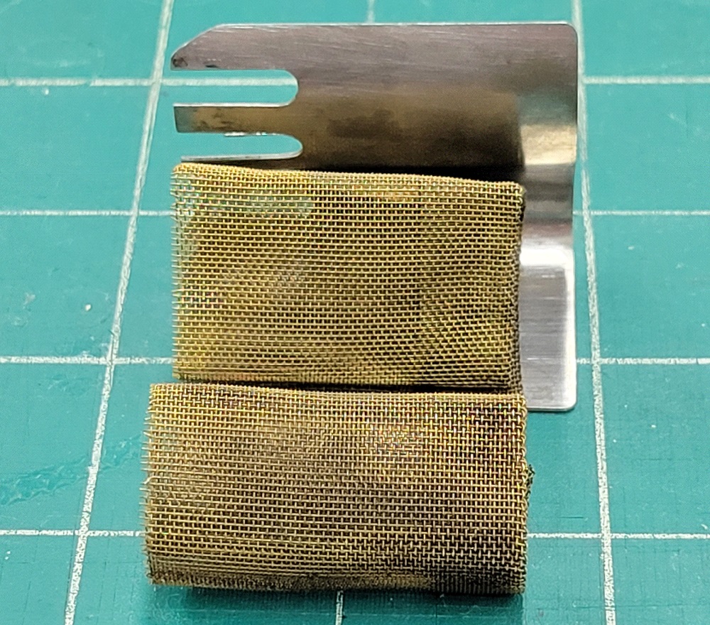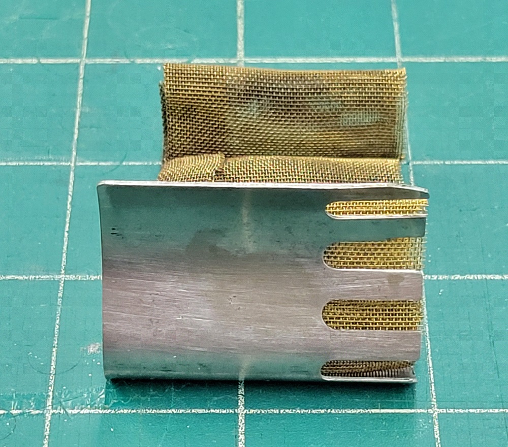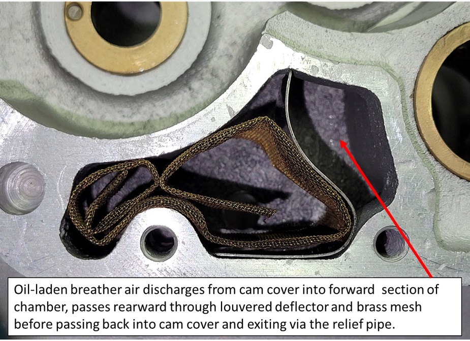 In the subject rear chamber, the air/oil stream navigates a tortuous path around a louvered stainless-steel deflector, and due to the significant volume of the chamber, slows down as it passes through several layers of fine brass screen that demist the stream by knocking oil droplets out of suspension. The following image, 9-1, shows the spring steel deflector and the brass mesh mounted in the rear chamber of the engine case, and, in a subsequent series of pictures, 9-2 through 9-5, the subject components are removed from the case to provide the reader a better appreciation for the shape and layout of these components.