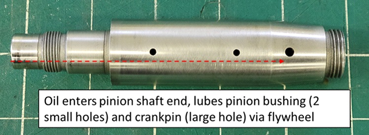 As shown in Figure 3, oil enters the end of the hollow pinion shaft and continues along it's length to lubricate the pinion bushing and ultimately to the flywheel taper where it feeds the crankpin and rods.