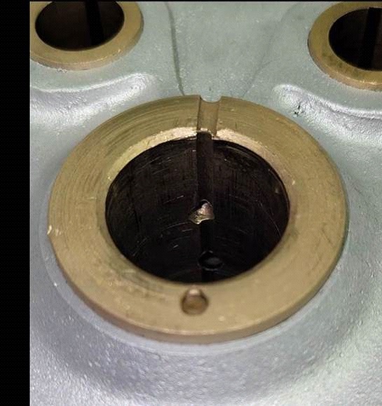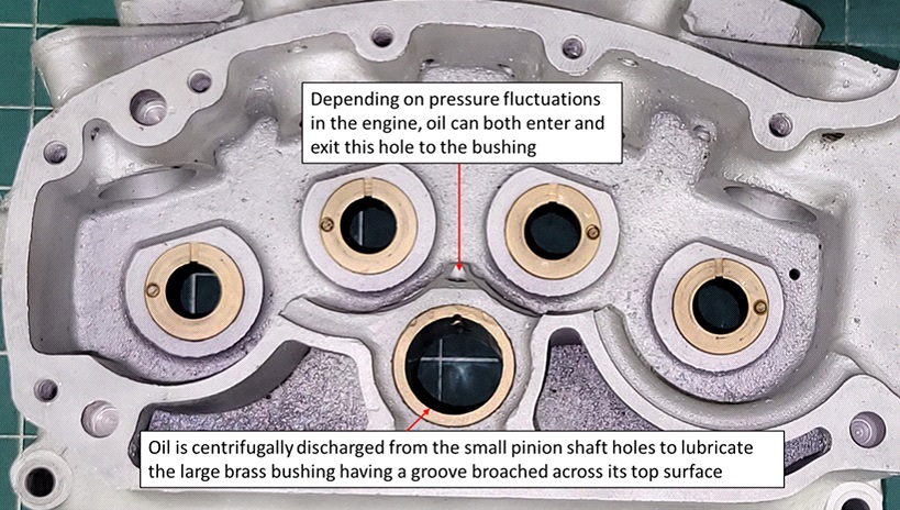 Note that the cam bushings as well as the pinion bushing have grooves across their top edge. When the pistons descend on the downstroke and create positive pressure in the crankcase, air/oil mist is blown out of these grooves into the cam chest where it lubricates all the components therein. In addition to the grooved bushings, there is a 1/8” hole forward of the #4 cam bushing that also passes air/oil mist to the cam chest.