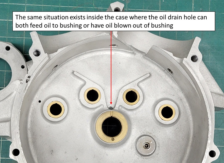 Figures 9 and 9A below show the complementary drilling in the cam chest cover/bushings that allow the cam breather holes to expel air/oil mist into the cam chest. The air expelled into the cam chest then enters the 6 holes surrounding the #2 cam bushing boss, where it descends straight down and exits a 7/16” ID pipe into a small crankcase chamber rearward of the pinion shaft. \\
