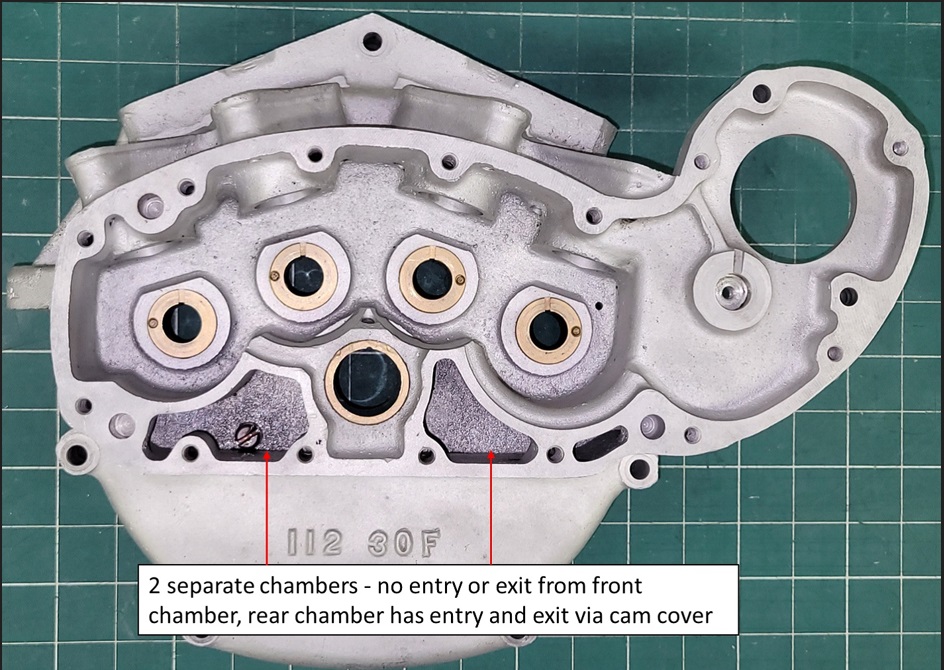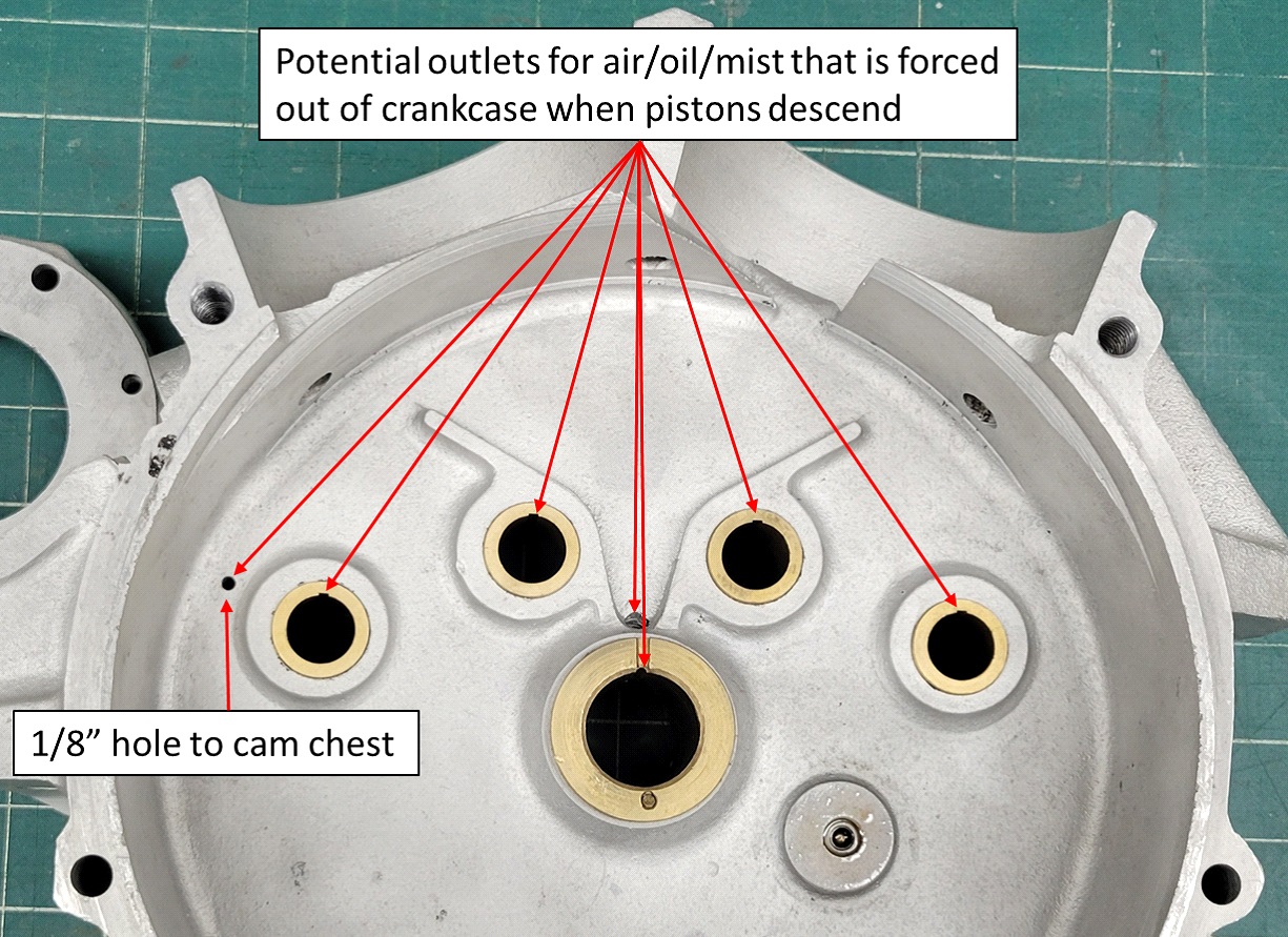 The left crankcase is sealed, with the exception that the labyrinth seal on the sprocket shaft allows a small amount of air to escape; thus, essentially all pressure created in the crankcase when the pistons descend exits the right crankcase into the cam chest. Figure 7 below shows the potential egress routes that air/oil mist may take to exit the right crankcase.