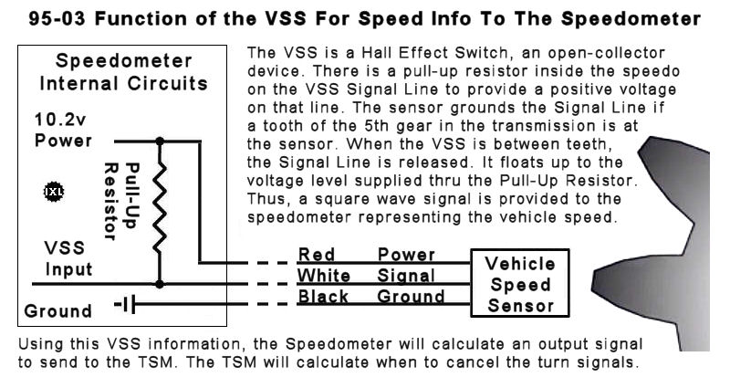 The Pre-95 speedometer used a mechanical cable to drive it - It had a reed switch (internal) which was activated to ground on each revolution of the cable… The White/Green wire to the TSM was internally (in the TSM) pulled to a high state and the reed switch pulled it to ground.