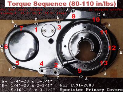 NOTE: using too much torque on these bolts has been known to strip the bolt heads and crack primary covers.