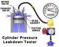 If you find you have low compression in a cylinder, you will want to do a Leakdown Test. This test will help determine the location of the leaking air, such as worn exhaust valves, worn intake valves, leaky head gaskets, or worn rings.