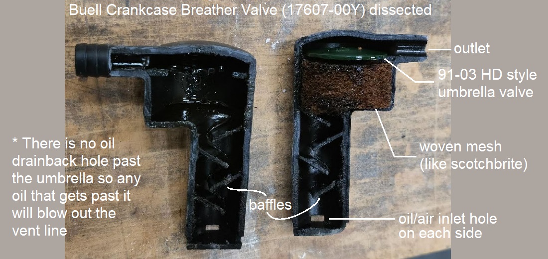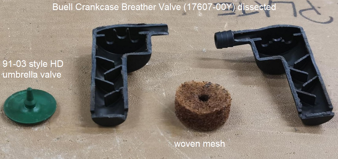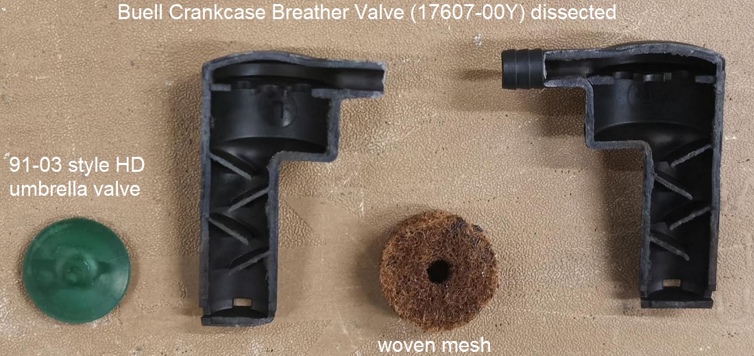 The Buell breather valve (PCV as it is called in the parts book) is nothing more than a variation of the HD umbrella valve with a woven mesh insert and oil separator labyrinth under it.