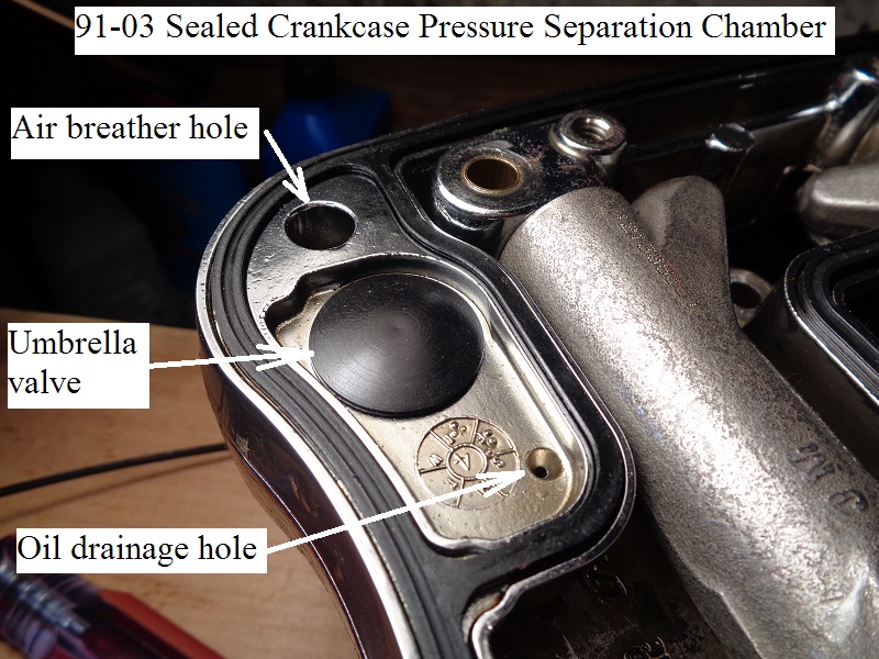 However, outside air can still enter through the oil drain back hole on engine vacuum cycles. - 1986-up breather valves also incorporate an oil drain back hole for engine vacuum to pull separated oil from mist back into the motor.