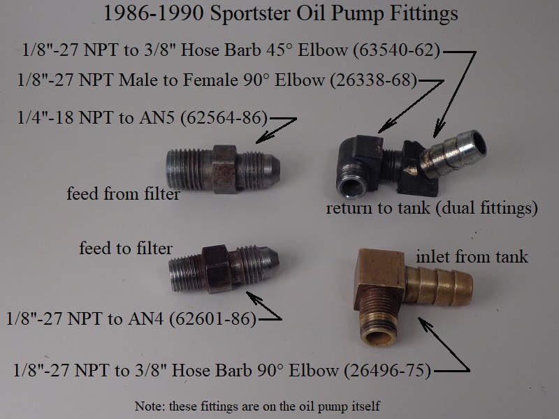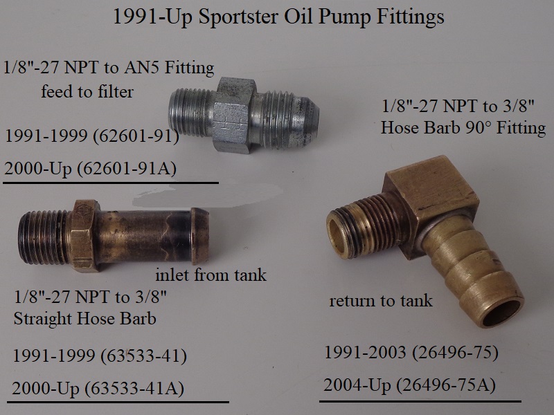 Different year oil pumps came with several different fittings. Part numbers and usage is labeled in the pics below.