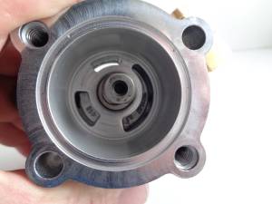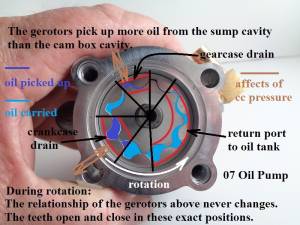 Return oil drops into the “duck bill” on the back of the pump, to the upper gerotors, to the upper front fitting, to the tank. - 1998-Up oil pumps also feed oil to the oil filter pad, with the (routing) difference being an added return inlet in the top of the pump.