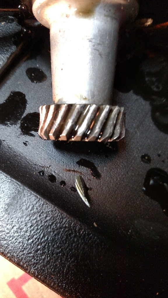 A chunk of a tooth from the oil pump gear fell out of the oil pump upon dis-assembly 57)