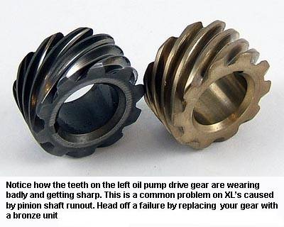 - But the MoCo never bothered to put it in XL's. It probably costs more than the steel gear, and given that failures are rare at 60hp, it just wasn't needed. But if you're hopping up an XL, it's a good piece of insurance. Especially if you're going into the cam box for a cam swap anyway, then it's a no-brainer in my opinion. It's a really ugly failure that generally requires a full tear down to fix. The gear is an ounce of prevention. 58)