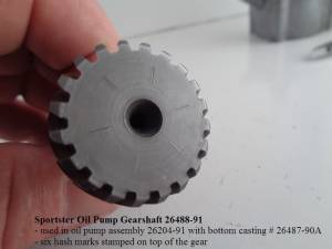 However, the gearshaft used in the pump with bottom casting # 26487-90A is .005” longer and has six hash marks across the top of the gear to distinguish it.
