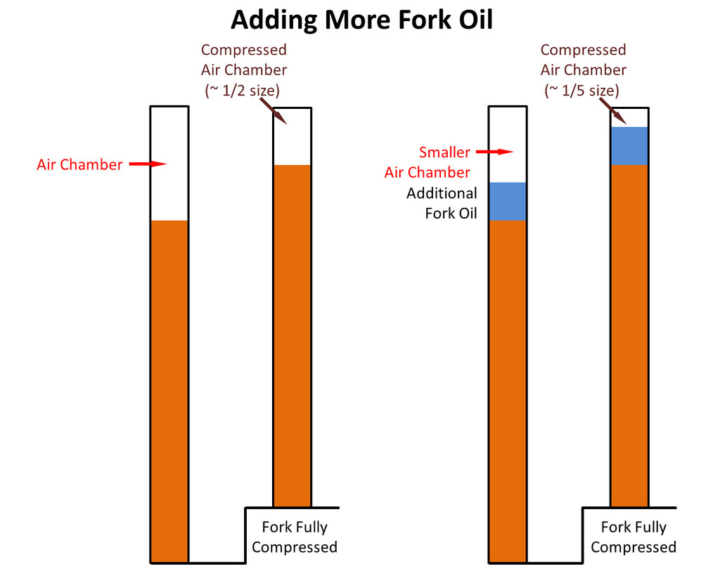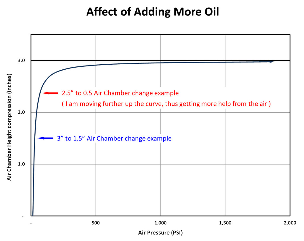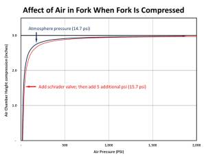 • As far as the psi scale up to 2,000 psi, what I posted was math extrapolations. I did not set up something, then measured it. I suspect the fork seals would not hold anything close to that pressure. Perhaps a few hundred psi max? If you had too much oil in, I suspect you would see weeping of oil on the fork tubes as well as experiencing the “hydro locking” condition. BTW, you are not adding 2,000 psi but just starting at atmospheric pressure and squeezing the air volume from 3” tall to 0.03“ tall which makes the pressure go to ~2,000 psi…