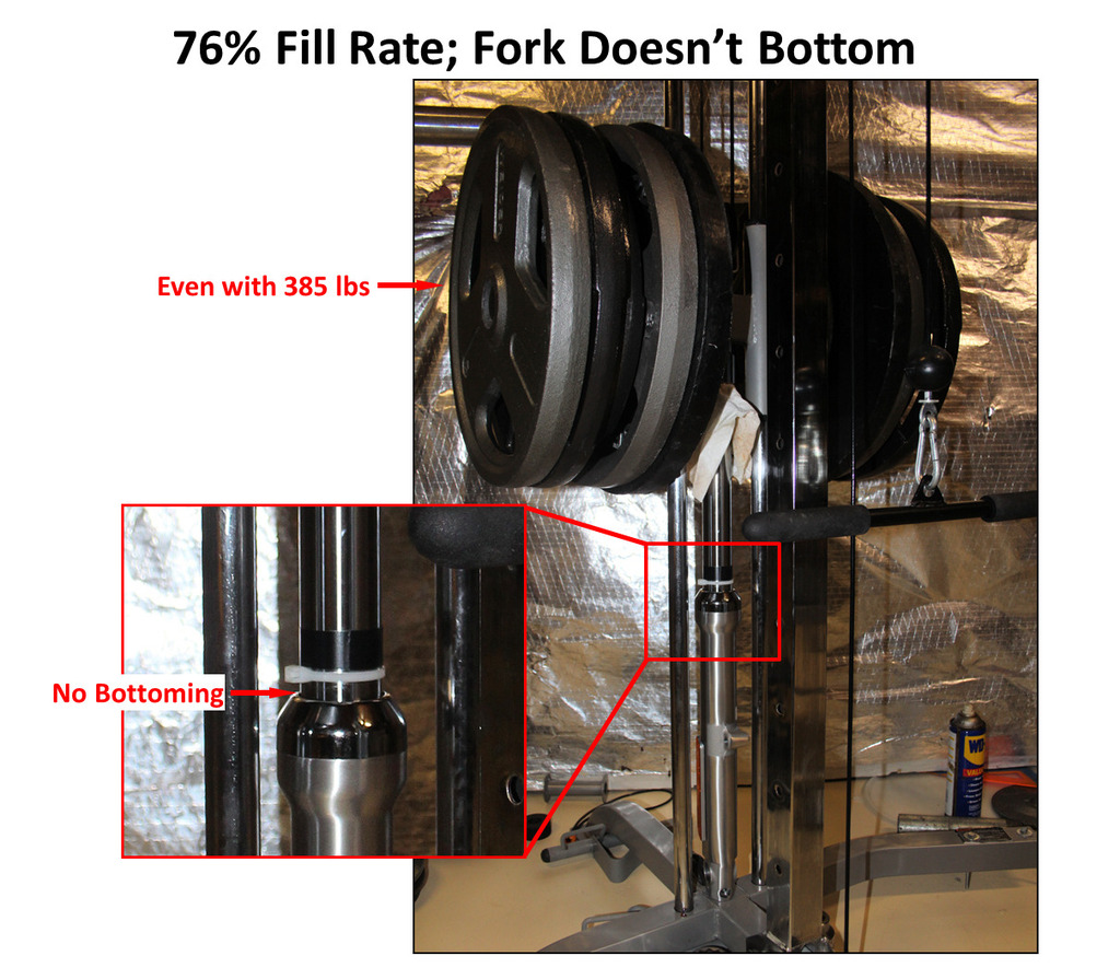 The true test of what the oil does comes from the weight testing. Here you can see what the spring alone does. As the weights are piled in increasing amounts, you can see the fork can hold up more weight for a given load - that is because of the help from the “air spring”. At a 70% oil fill, the fork can hold up an extra 61 lbs (214 to 275) before bottoming out. I next tested the “add an extra ounce” option taking the fork to a 76 % fill. You can see from the red line, the fork doesn't bottom out even with 385 lbs on it. I test one more point, a 73.5 % fill, and it looks to be the one to go riding with. It looks like it would come very close to bottoming out but only after it adds another ~ 100 lbs (~320 vs 214) of capacity. Hopefully this will be enough to keep me from bottoming out tomorrow. But, for short forks, maybe only add a half ounce. 13)