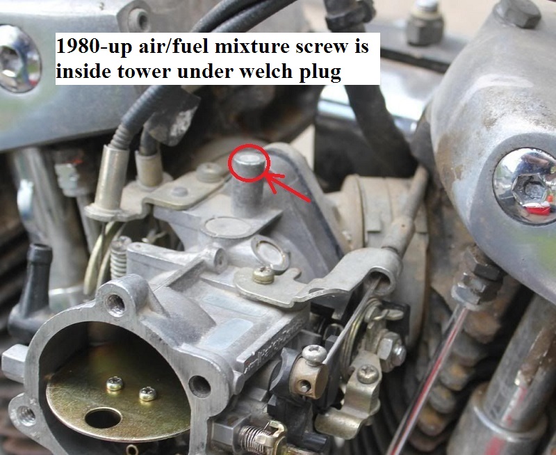 A washer between the seal (O-ring) and the spring was added in 79 to protect the rubber O-ring from damage from the spring. - On 80-up carbs, the screw is inside a towered boss under a (non removable) plug.