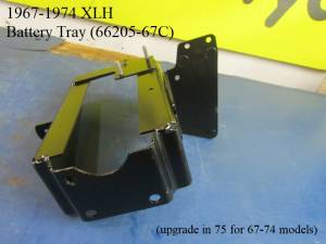 - Same base frame as 67-77 XLH battery trays with (3) mounting holes in the rear wall and the welded mount on left for a rubber isolator mount.