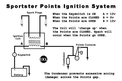 PRECAUTION: If the engine happens to stop on the 'dwell' part of the cam position lobe, the GROUND thru points will keep power active on the coil if the RUN switch is ON. This means, if you turned the key on (or leave it on), with the RUN switch ON, without starting the engine, the coil will be in constant current saturation and will eventually 'burn up' the internal windings.