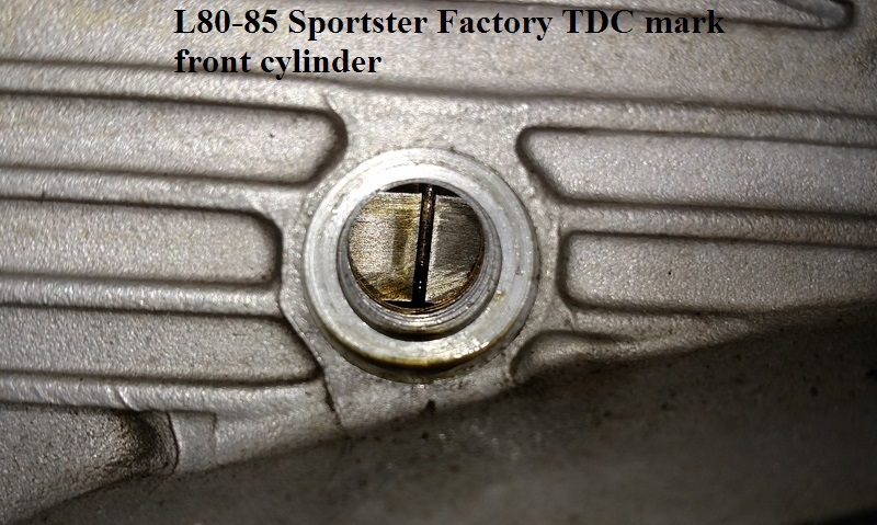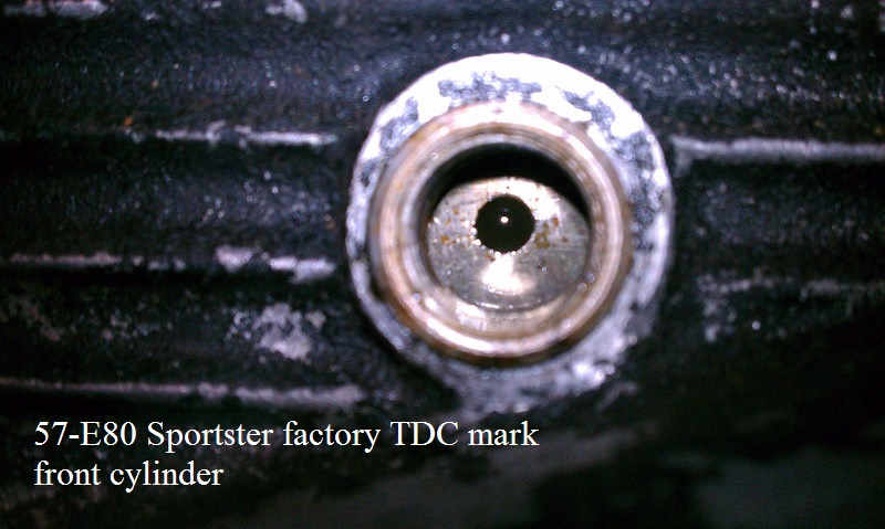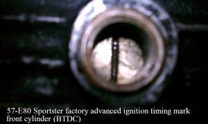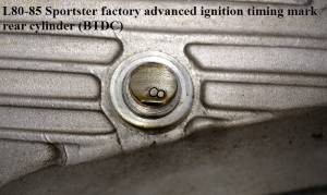 The front cylinder advance timing mark has changed from a straight line to a 1/8” dot and the rear cylinder advanced timing mark now represented by a lazy eight.- The single dot is 40° BTDC front cylinder (factory advanced ignition timing setting).