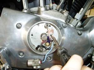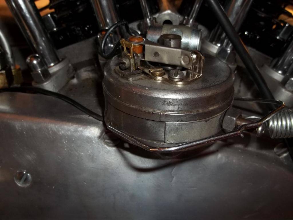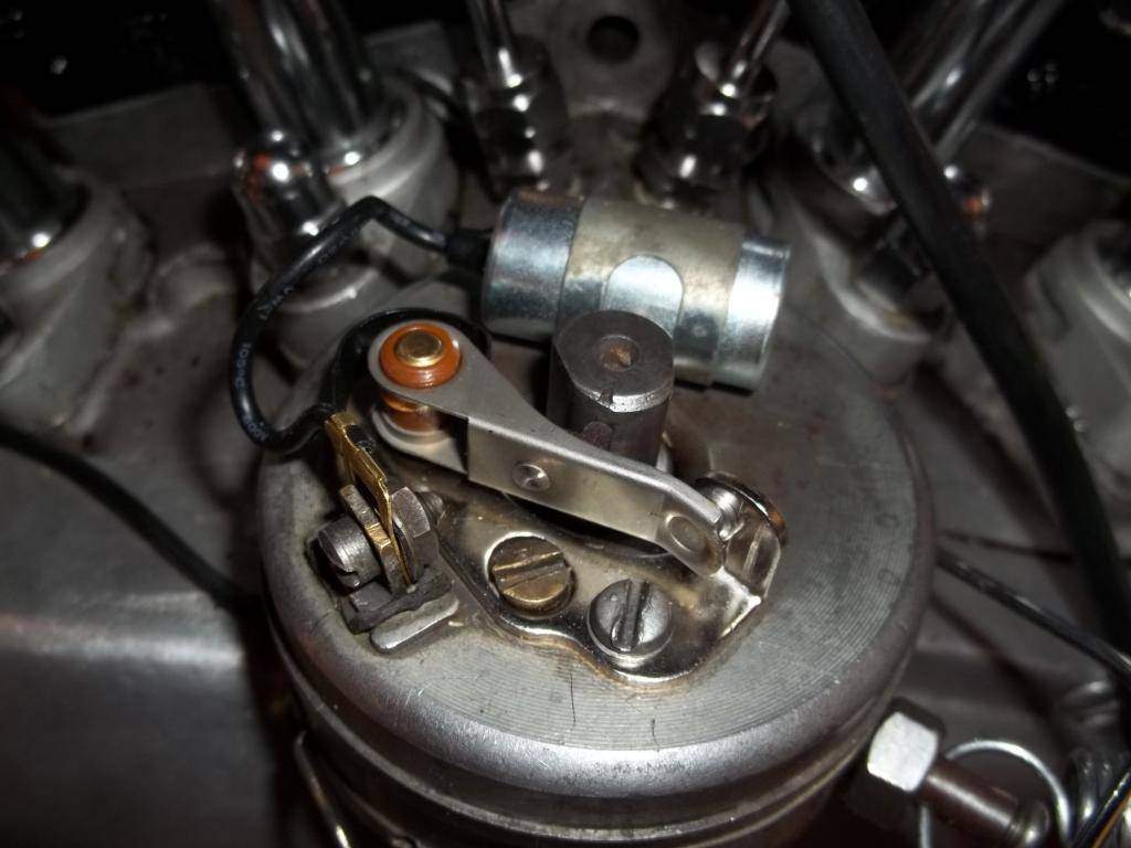 - If it sticks there, or slips out before the points cam reaches the full advance position and stops, adjust the points backing plate to move the points to the right position.