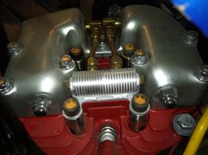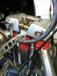 | A piece of angle iron holds down the center bolt section and also serves as a place to the mount air cleaner/carburetor stabilizer brackets. 24) Machined little oil coolers help add some extra cooling for the exhaust area. |