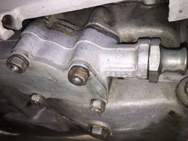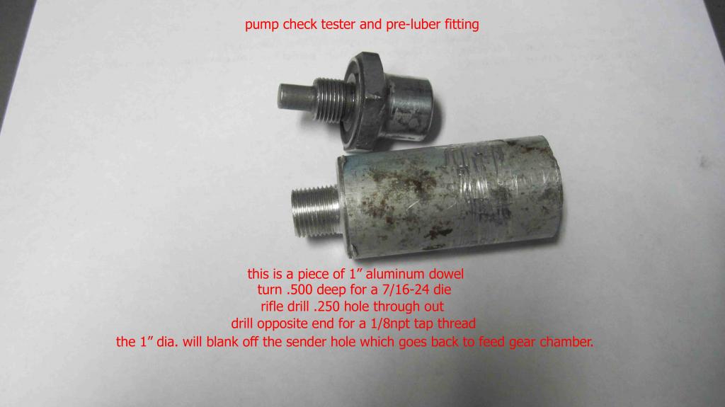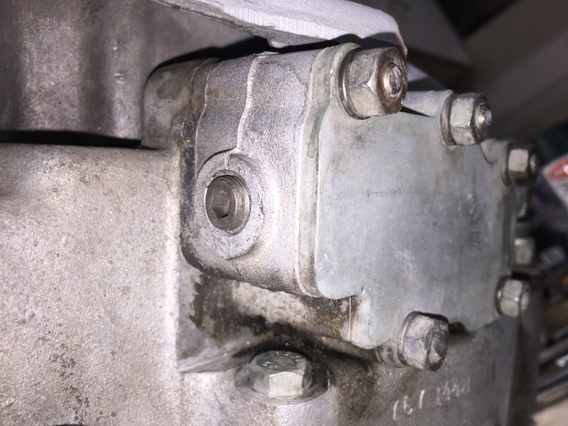 A drilled hole in the lower front intercepts the feed path to affect the oil sending unit in the front of the pump.