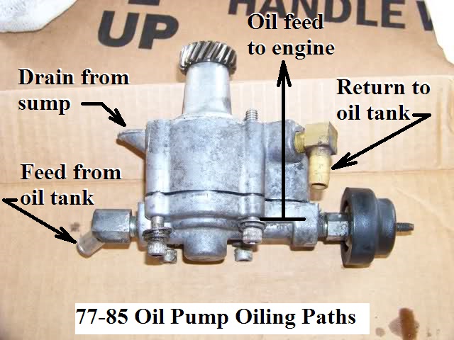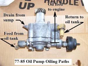 - 1977-1985 oil pumps feed oil to the motor from the top side of the pump.