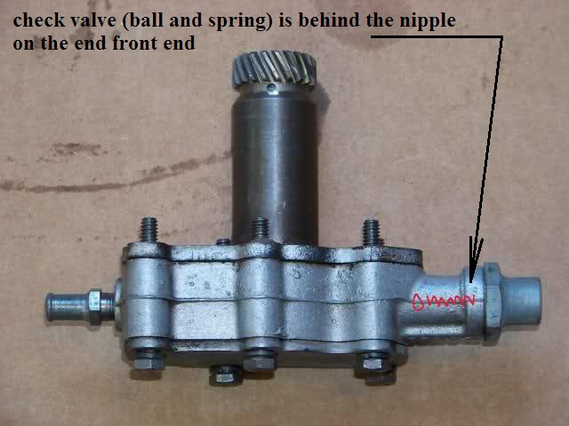 The 1957 pump has the same pump body, 16T gears, covers and breather gear with a new check ball spring and oil switch nipple.