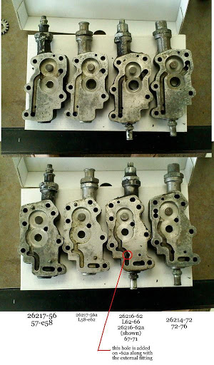 The 1956-1958 pump body has the rear port cast shut starting in 1956 (as this is where the 52-55 feed bypass was installed).