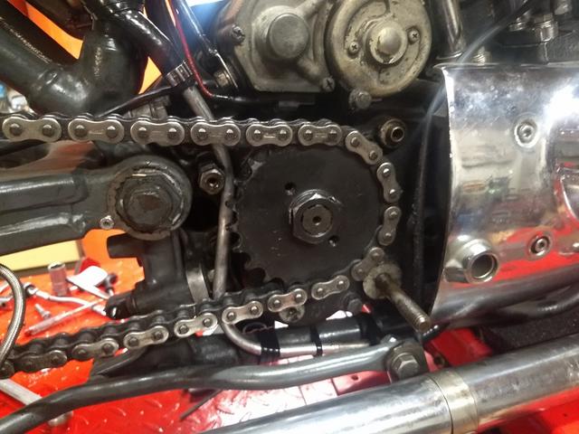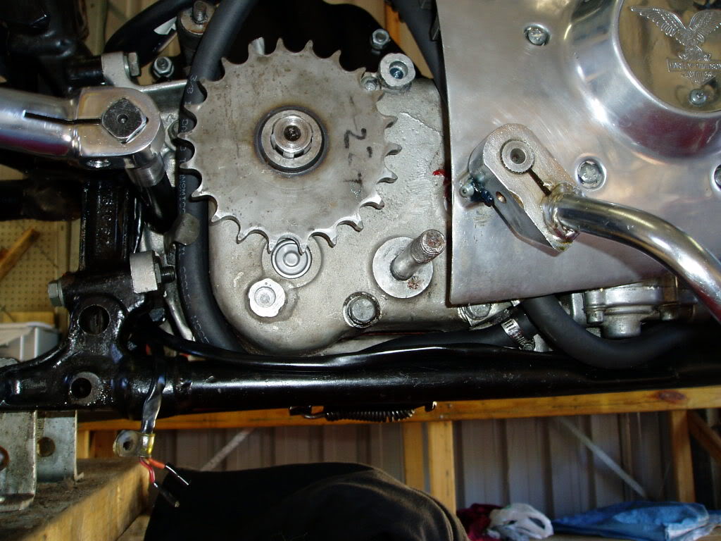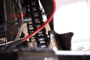 Feed line runs out the bottom of the oil tank, close to the chain, around the swing arm and under.