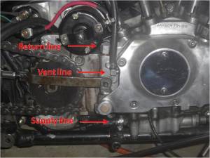 - Vent line from the oil tank is on the top of the case behind the rear cylinder (lowest and smallest, 1/4“ hose fitting).