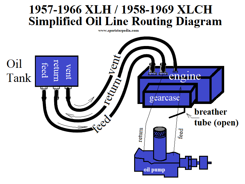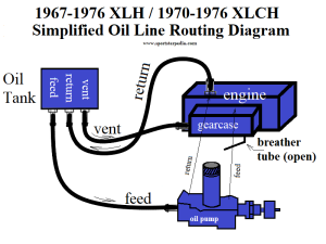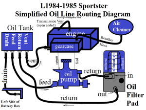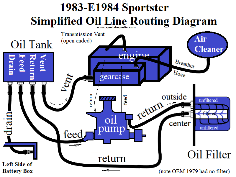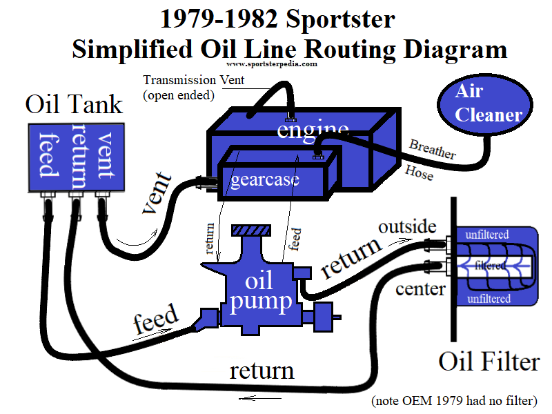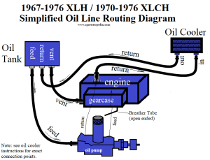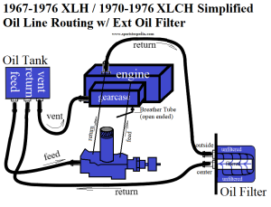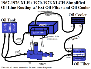 To use an external filter on XL/XLH models, the oil filter has to be removed from the tank and the plumbing for the oil filter and oil cooler are shown in the diagrams below.