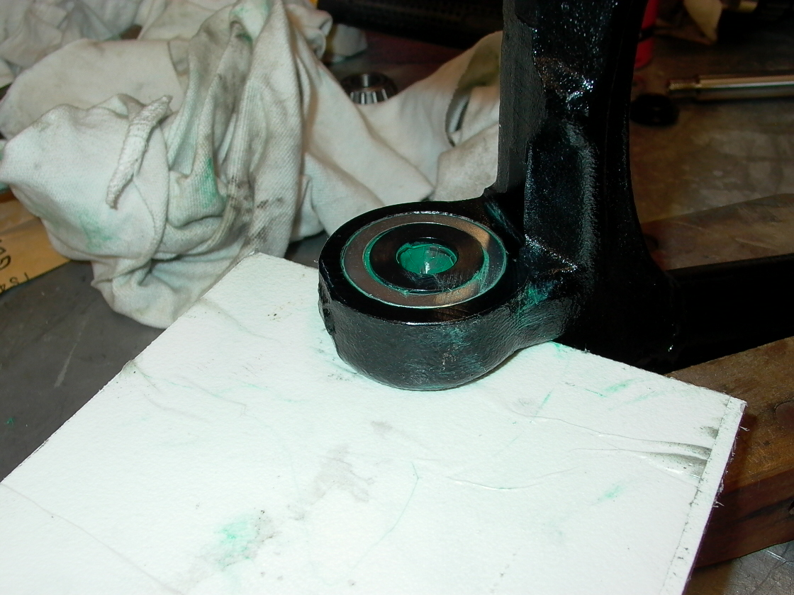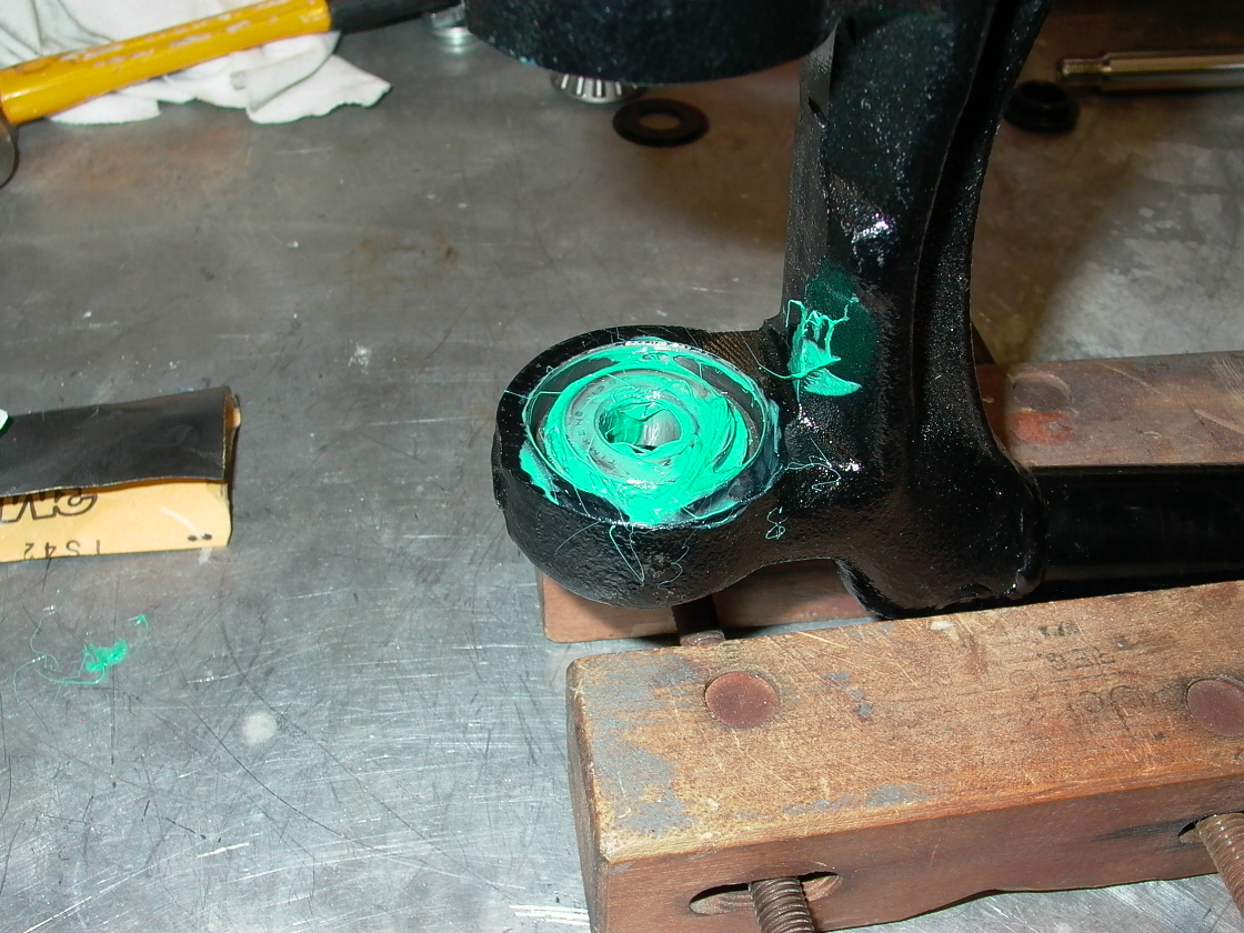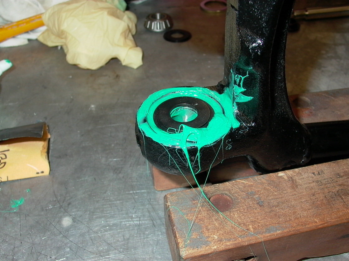 | Use some 800 wet/dry sandpaper to smooth the surface 13)→ | Press the outer races into place using an appropriate tool.14) | Grease the tapered roller bearing. I used a very sticky marine grease that won't wash out. It's not for bearings that rotate at high speed like wheel bearings but will be fine for the swingarm that just oscillates through a small arc. 15) |