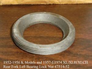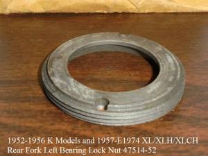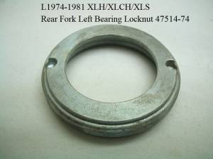 A number of 1972 Sportsters were produced from November 1, 1971 to March 29, 1972 without the (3 position) stake operation performed on the rear left side fork bearing lock nut (47514-52). Bearing pre-load (which should be kept at 1-2 pounds) is controlled by the left and right (47515-52) bearing lock nuts. The affected VINs were (3A or 4A) 18748H2 to 33040H2. This safety defect prompted a recall of the affected bikes with the dealer being required to remove the rear fork for inspection and stake any of them that were done previously at a rate of $7 reimbursed labor and handling. 1)