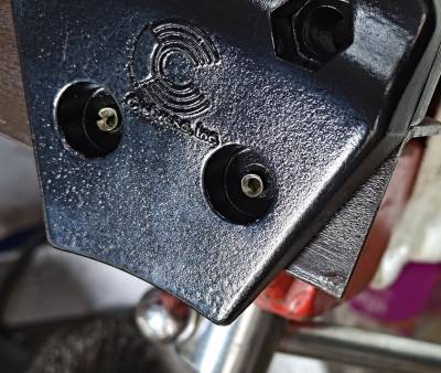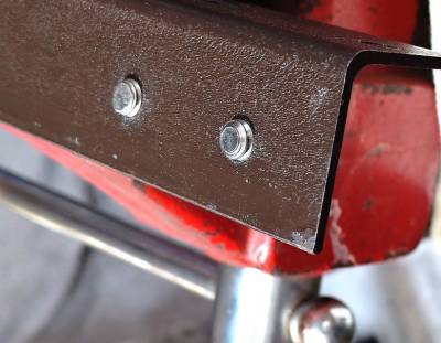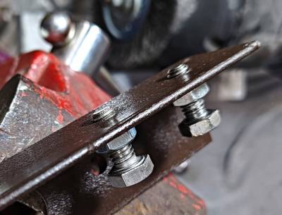Here is another take on the hammer and punch method using a jig made from a piece of steel angle. Two holes were drilled in the angle and tapped for two 5/16”-18 holes to match the holes in the pads. Two short bolts were adjusted to fit against the rivet heads. The bolts were locked in place with nuts. The jig is then clamped in a vice.