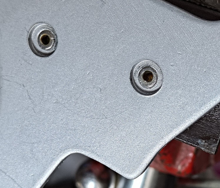 The outer pad and rivets are positioned on the floating pad plate and set on the jig. The rivets are hollow. Dims on the rivets: Head OD .294“, Body OD .139 and Length .315 7). A tapered center punch was used first to flare the tips. Then a flat 5/16” punch was used to flatten and secure (tighten) the rivets and pad. Be careful not to over-tighten and crack the pad.