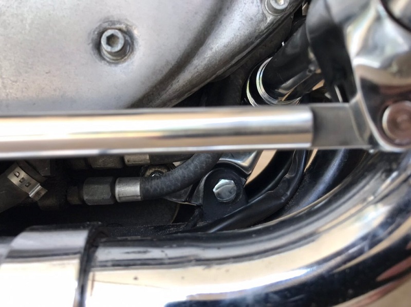 Two wrenches are needed to unscrew the old OEM rod and install the new longer one.