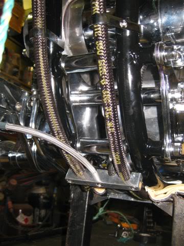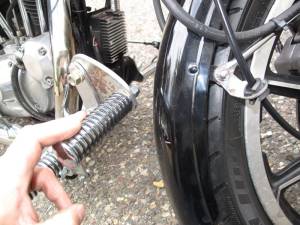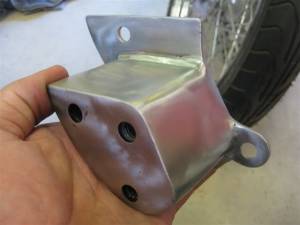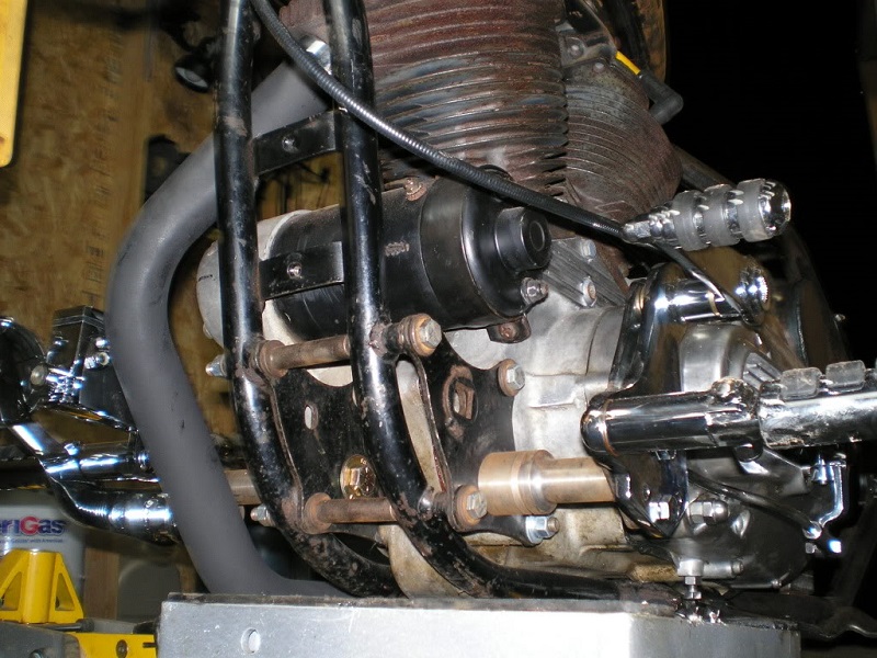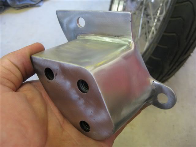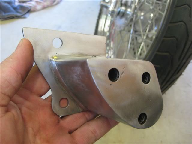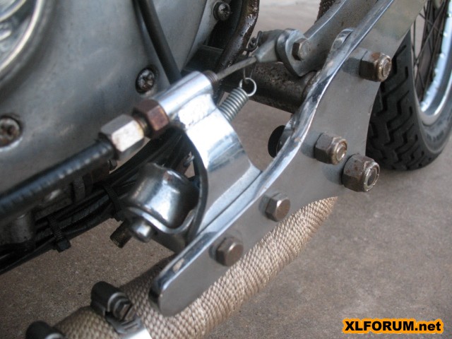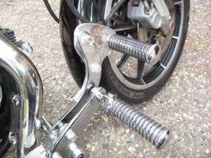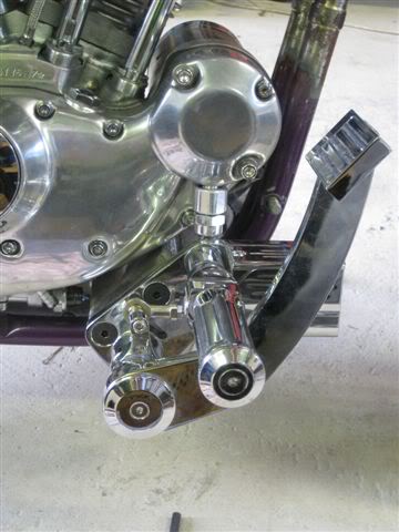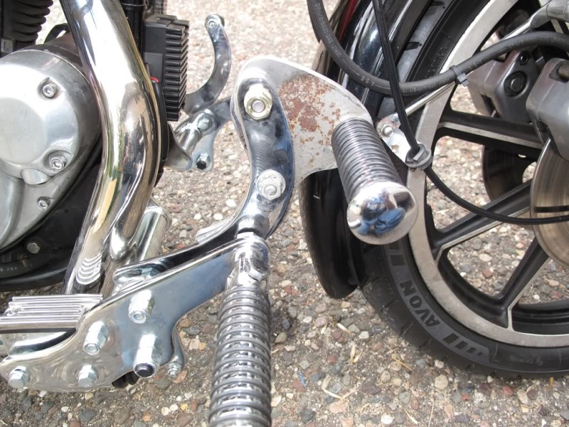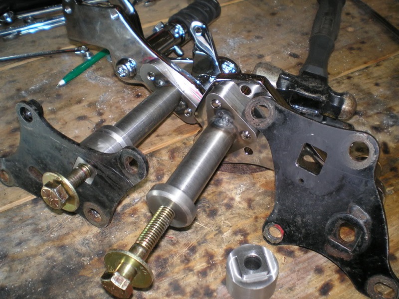 A pattern was cut out of a 1/4“ plate. Once installed, it moves the peg forward so you don't have to lift your leg off foot peg to hit the brake.
