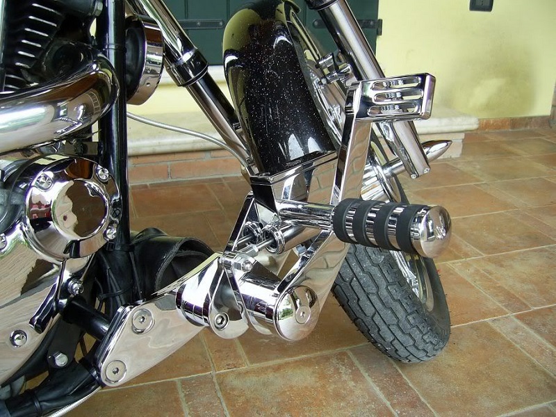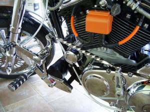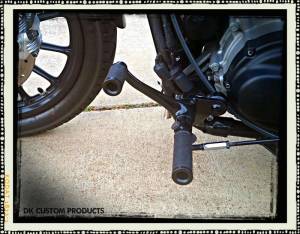 The shift & brake arms as well as the foot pegs then mount 6“ forward from the stock location helping people with a long inseam stretch out.