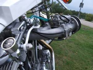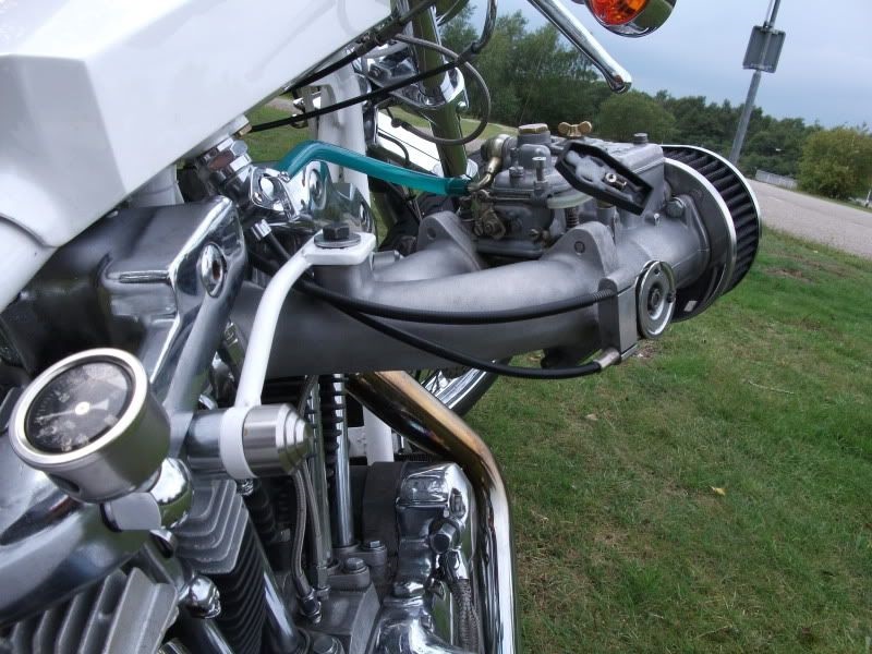 The angled manifold that swings the carb towards the front of the bike, giving you leg room to tuck in behind the manifold / carb.