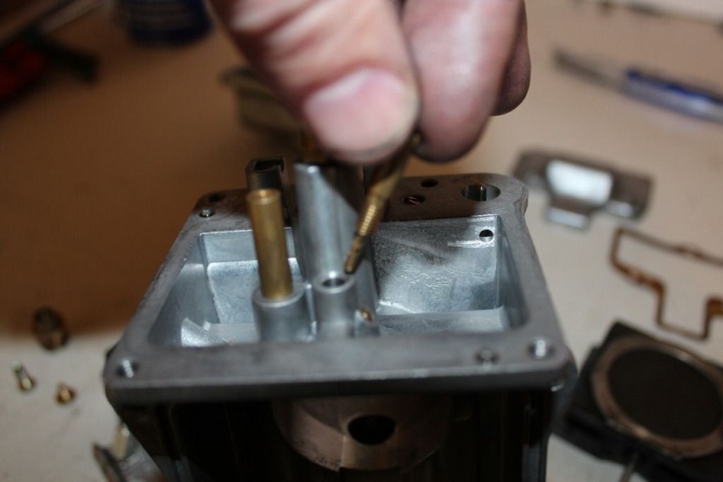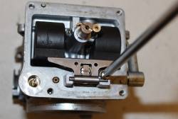 Remove the float assembly by unscrewing the float pin screw. The plunger of the needle valve assembly will come out with it.