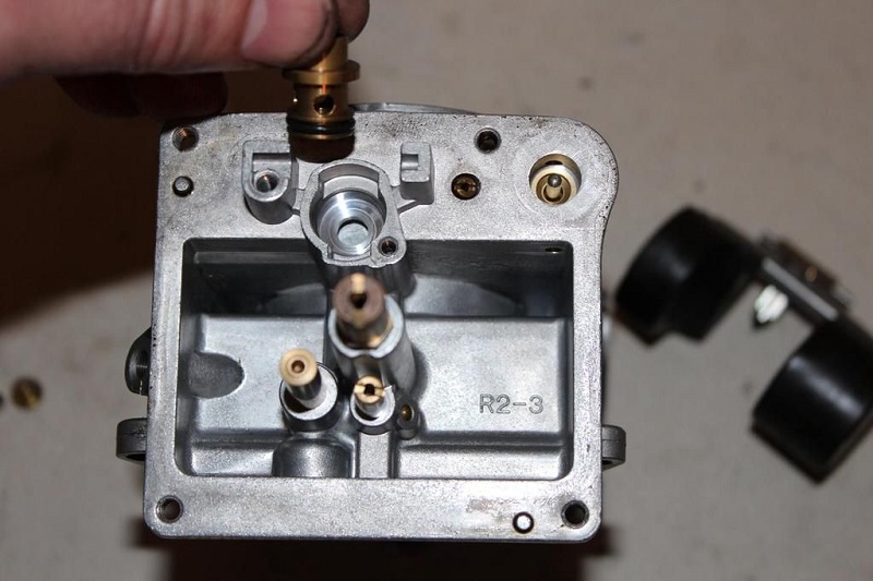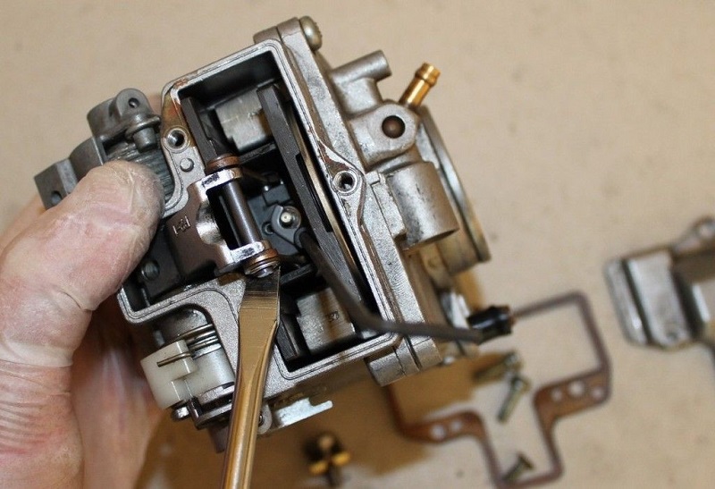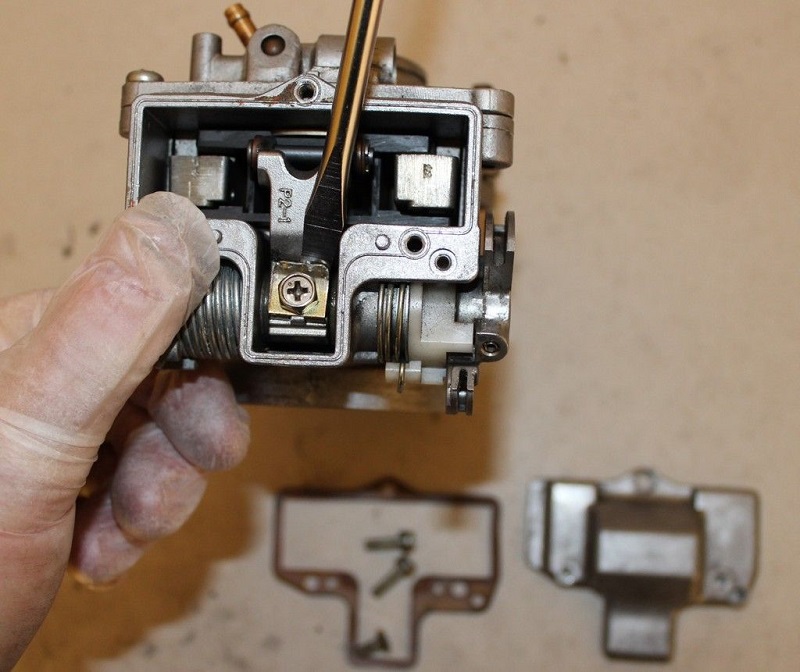 You can then remove the 3 remaining screws to remove the back carb body and 4 screws to remove the float bowl.