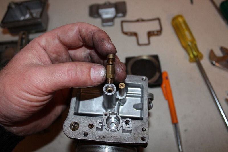 Remove it and the rubber boot which has a replacement in the kit and the accelerator pump nozzle next to that.