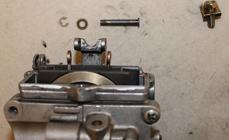 With the bolt removed, lift up the throttle slide, and remove the E clip, washer and slide out the link lever pin.