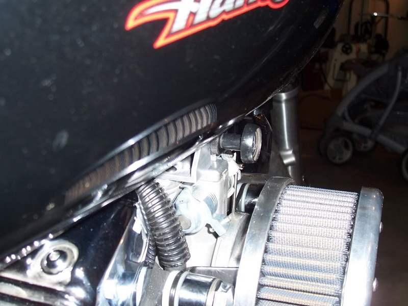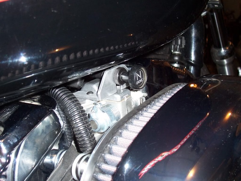 This homemade bracket will help to relocate the choke to the right side between the tank and the top of the carb.