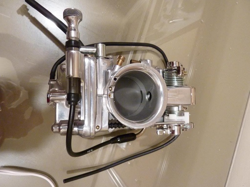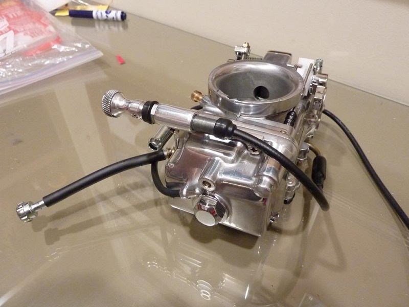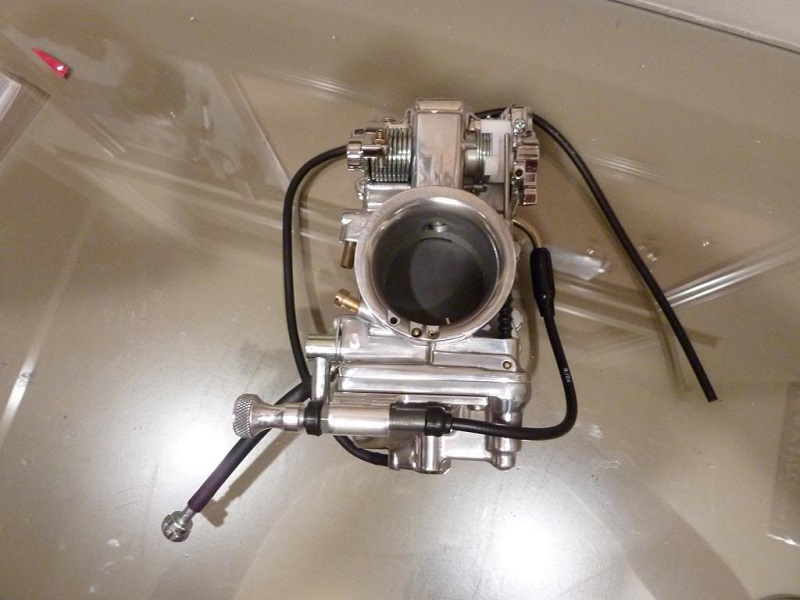 Pictured is a top view of a before part, the lid off the Mikuni HSR-42, and the finished part.