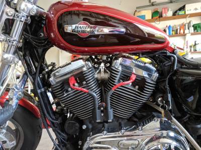 Since I have a 1200 custom, maybe this is only possible with the larger tank, but you cannot see any wires unless you get down on the floor and look up into the tank. I also swapped out the low gas sender on the fuel pump and installed the HD tach/speedo combo gauge, so you can see the new gauge in a couple of the photos. This new tach is great… 4 segment fuel gauge, tachometer, gear indicator, miles to empty, whole bunch of stuff… highly recommended if you want more info.