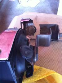 | Before pic. Note the relative pristine condition of the horn mounting bracket, p/n 69129-72. 1) | After pic. Back in the garage, with pics of the horn mounting bracket, et al, after removal. 2) |