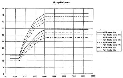 The first 12 curves are named for their timing value at WOT (for example, 34A = 34 degrees of advance at WOT, group A). The procedure is to use the highest advance curve, in the appropriate group, without pinging. (However, other techs suggest using a max of 28° of advance for built motors because pinging starts happening before you hear it. So, it may be better to use curve 28b or other less aggressive curves.)