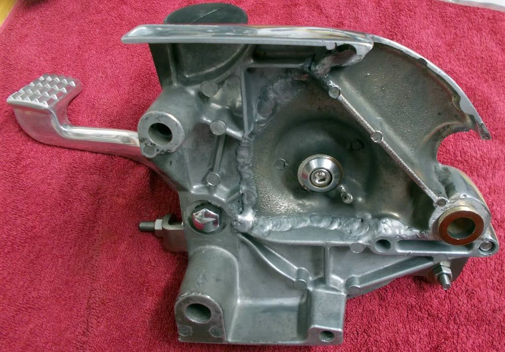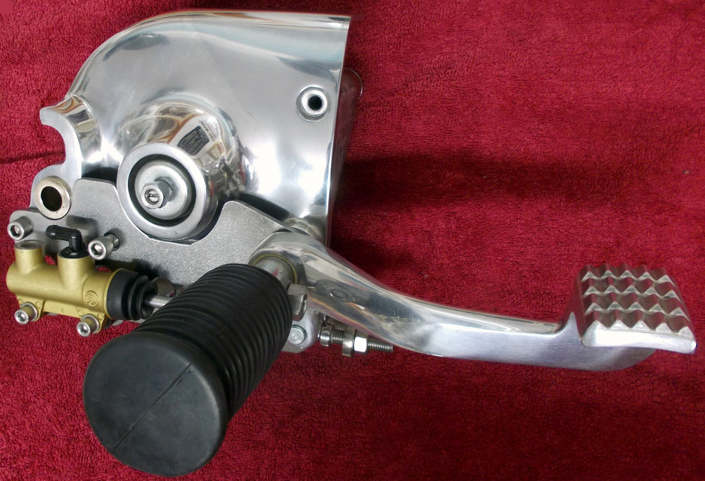 Stock brake pedal with a fabricated steel backing plate and rod plunger to run a Brembo PS11 master cylinder. 4)